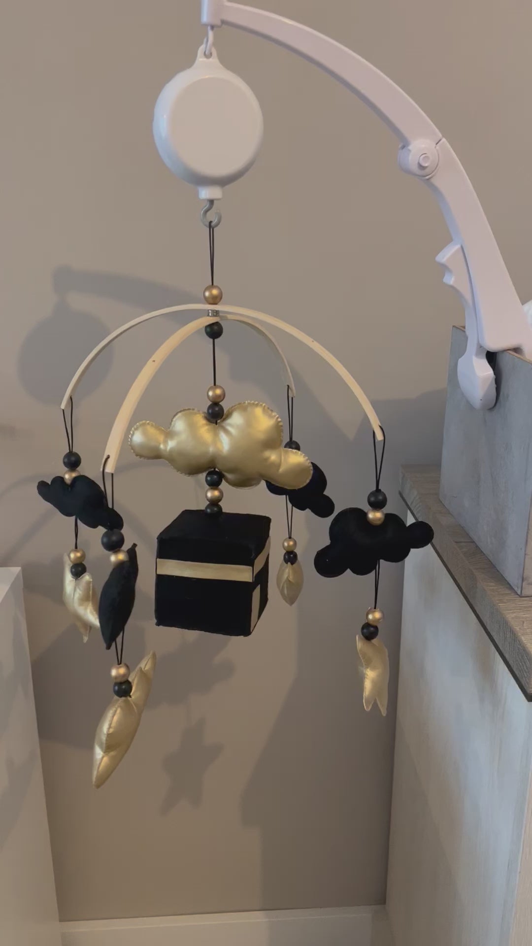 Handgemaakte babymobiel met Kaaba. Gemaakt van zachte en veilige materialen. Een uniek en betekenisvol detail voor de babykamer. Perfect cadeau voor geboorte, aqeeqah of babyshower.
